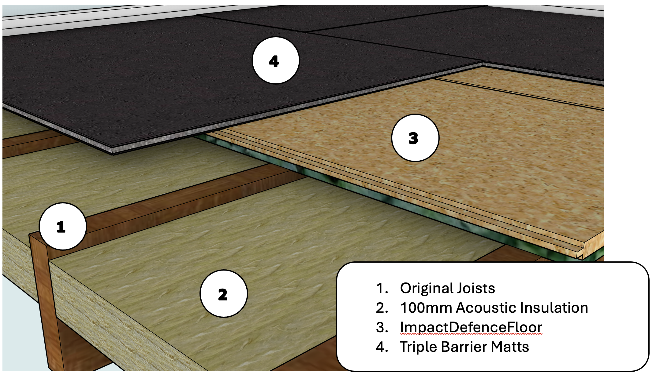 | Acoustic Mineral Wool & ImpactDefenceFloor (IDF) & Triple Barrier Matt |