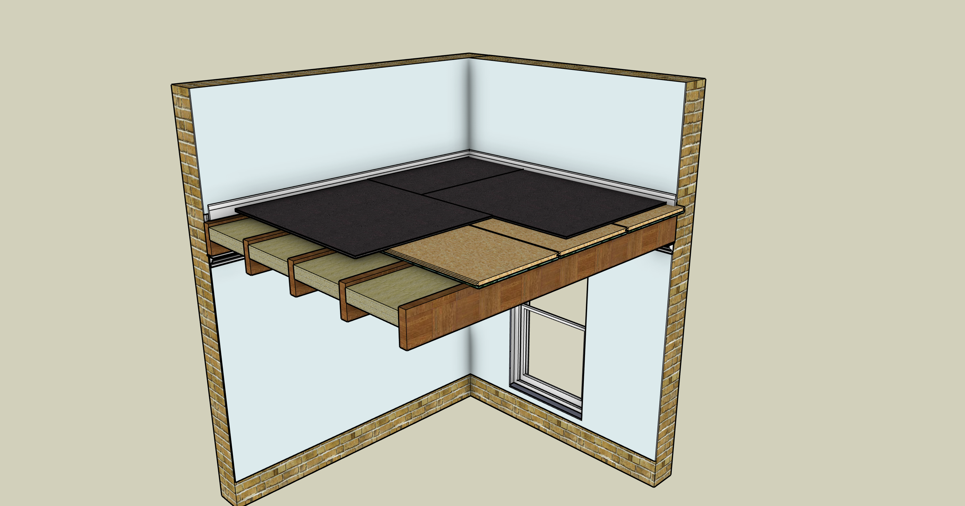 This is the highest level base system we offer, and typically used for Part E level soundproofign. A highly effective service if you are looking to have brand new flooring fitted in the room in question that is both effective towards airborne and impact sound, but more effective for the latter. Generally speaking the acoustic mineral wool and ImpactDefenceFloor (IDF) & Triple Barrier Mat is used to meet current building regulations, or when the highest levels of impact reduction are required. The main materials used in this soundproofing solution are Acoustic Mineral Wool & ImpactDefenceFloor and Triple Barrier Mat. Mineral wool soundproofing is tightly fitted between the existing floor joists once the original floorboard is removed and disposed of. Acoustic Mineral Wool is designed to target airborne noise specifically, but can also be effective in minimising impact/reverberant sound. Once the wool is packed between the joists a T&G (Tongue & Groove) acoustic chipboard flooring deck with impact protection properties is fitted over the entire floor area. Finally, a 15mm rubber sheet is laid on top to maximum protection. The flooring will not be fixed to joists as we need to keep the floor floating because by minimising the contact between the below room and said room, we will minimise how much impact sound travels throughout the rooms. Perimeter strips will be installed as standard to minimise flanking noise travelling down the walls.