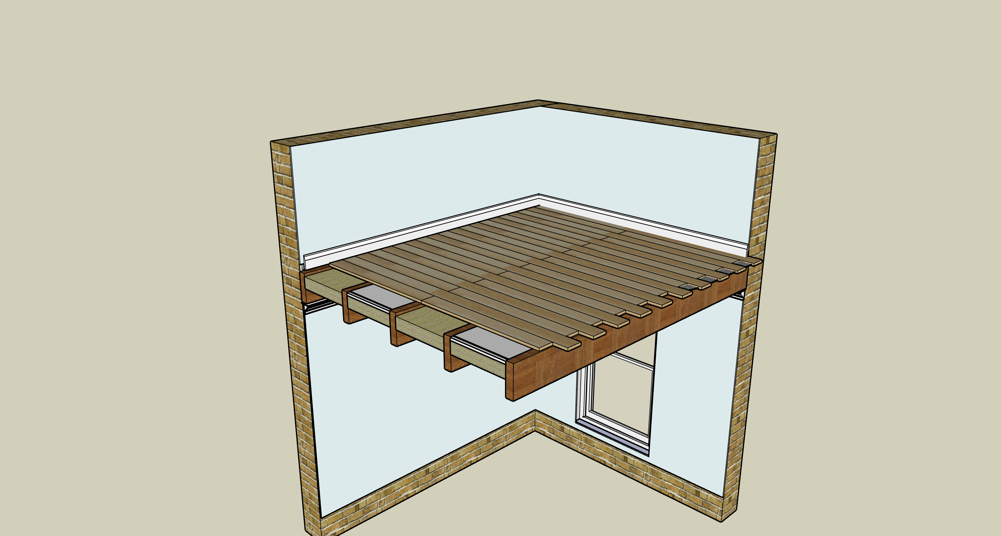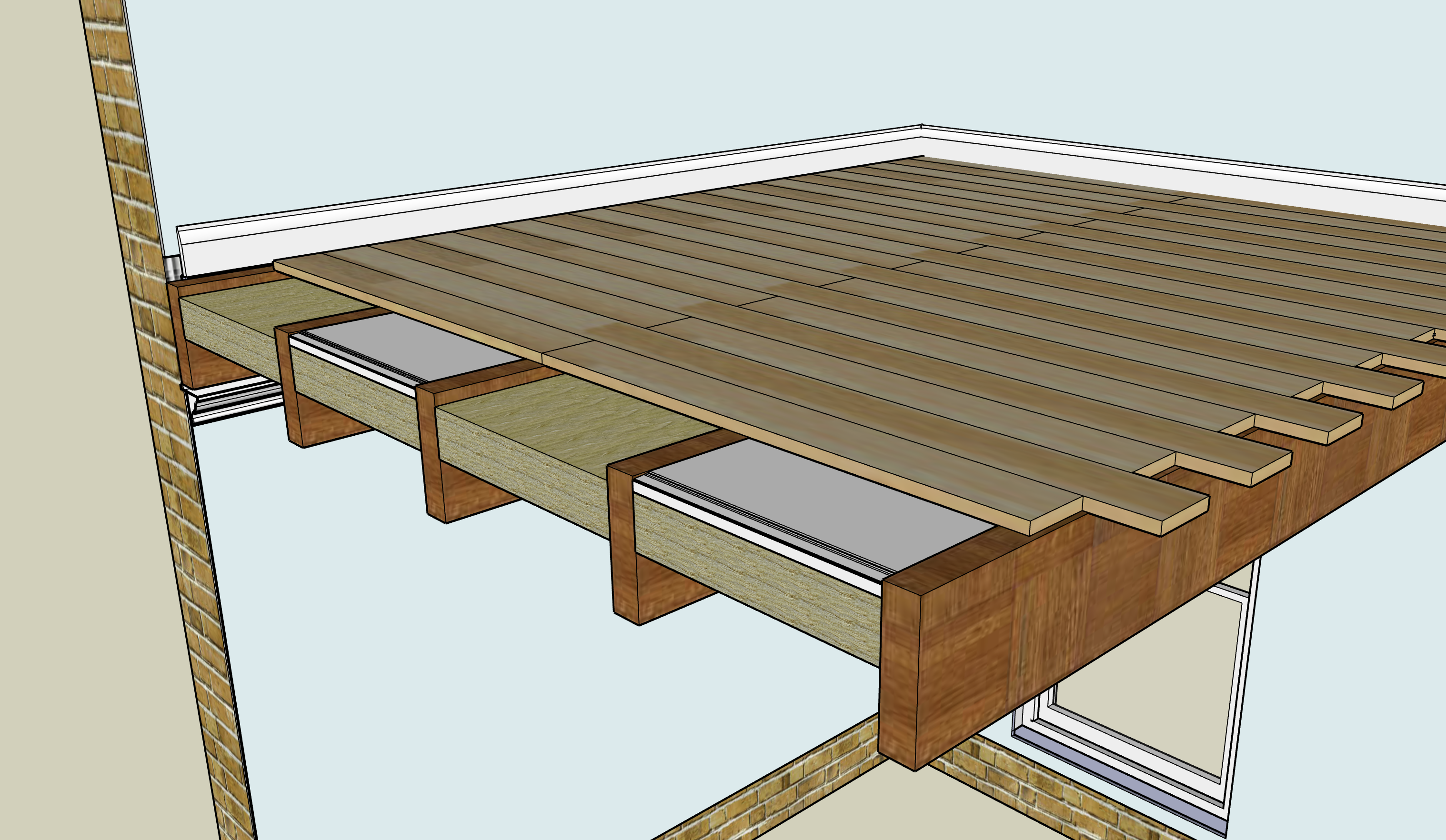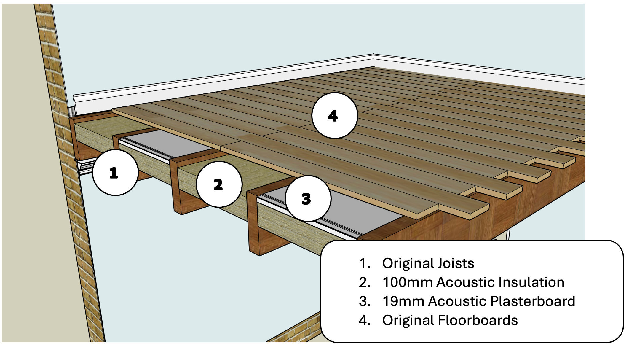 Airborne Noise. Not as effective as the over floor system, but installed in rooms were no floor height gain is needed or the client want to keep the existing floorboards exposed. Floorboards will be lifted to expose floor joists. Mineral wool is friction fitted between joists and 19mm planc cut to size and fitted between joists. Edges get sealed with acoustic mastic. Floorboards fixed back in place. All gaps between floorboards are sealed with acoustic sealant if the floor is going to be covered by carpet/laminate ect.
